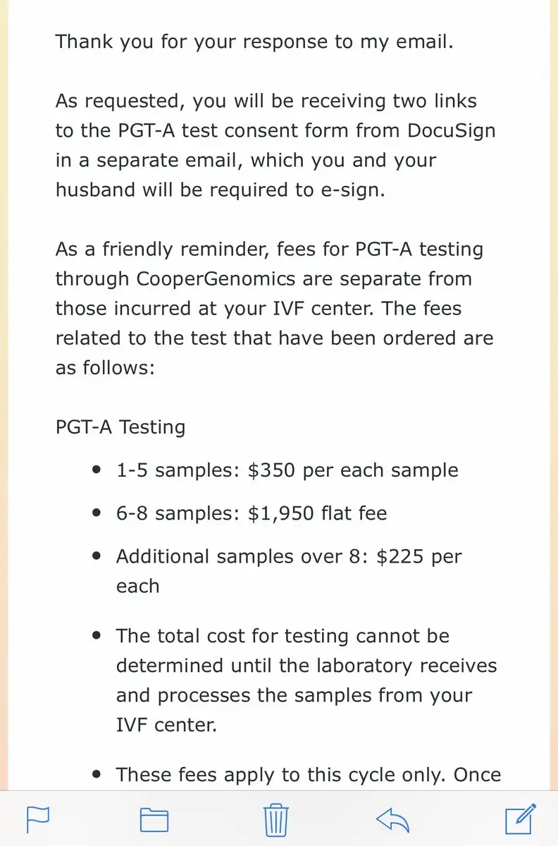 bana soylenen fiyat $3450. Ama bana genetigin yapilacagi yer fiyat olarak$2220 yazdi 9 embrio icin. Benim klinik cozdurecek ornek alip oraya goturecekmis. Geri kalanini da herhalde Benim klinik alir. Ben de tam olarak nasil olacagini bilmiyorum. Burada gelismeleri yazarim size.