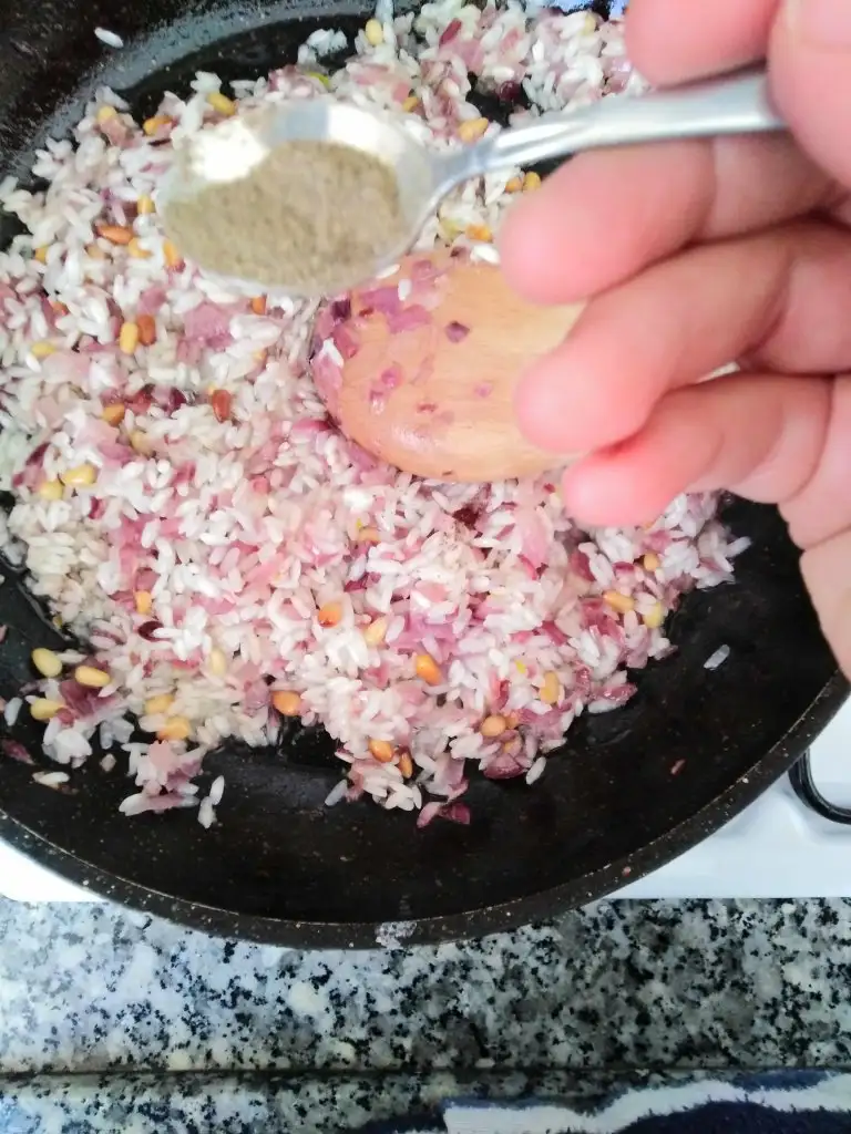 Pirinçler kavrulduktan sonra damak zevkinize göre karabiber, kimyon ve kuru naneyi koyuyoruz. Ben karabiberi yarım çay kaşığı kimyon ve naneyi bir çay kaşığı koydum.
