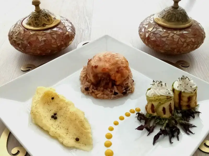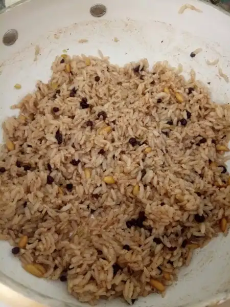 Tereyağını eritip içine minik doğradığımız soğanlarımızı ve fıstıklarımızı atıyoruz. Her ikisi de pembeleşinceye kadar kavuruyoruz. Sonra yıkayıp süzdüğümüz pirincimizi katıp 5 dk daha kavuruyoruz. Hepsi kavrulunca üzerini geçecek kadar su ilave ediyoruz. Ve içine sırasıyla tuz, kuş üzümü ve tarçını ilave ediyoruz. Altını kısarak pişiriyoruz ve suyunu çekince altını kapatarak onu da dinlenmeye alıyoruz. Diğer tarafta dinlenmiş olan butlarımızı alıyoruz ve küçük bir çorba kasesine yerleştiriyoruz. Sonra ortasına iç pilavımızdan 1-2 kaşık kadar koyup kapatıyoruz. Sonra fırın tepsimize ters çevirerek bırakıyoruz.