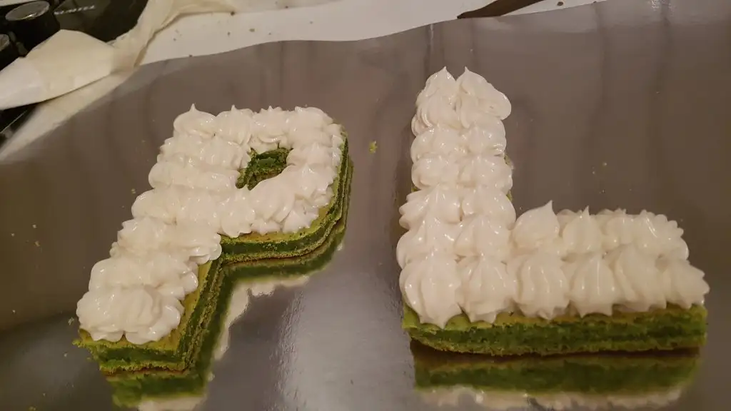 Fırından çıkan kekin ilk sıcaklığı geçince 4 esit parçaya kesiyoruz. Harf kalıplar icin yağlı kağıdı kek parçaları ölçüsünde keserek p ve l harfinin kalıbını çizip kesiyoruz.