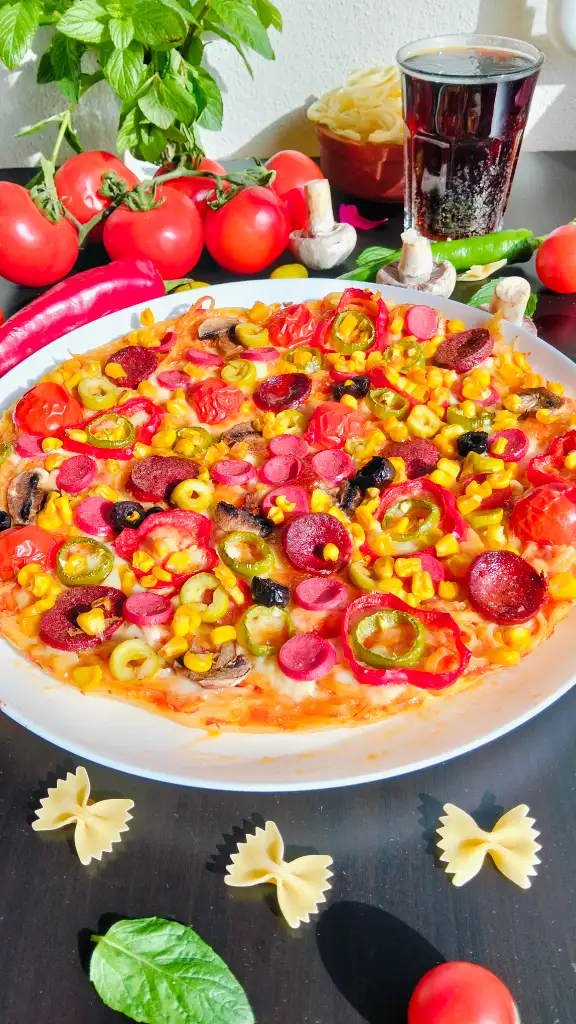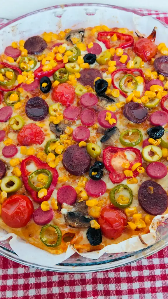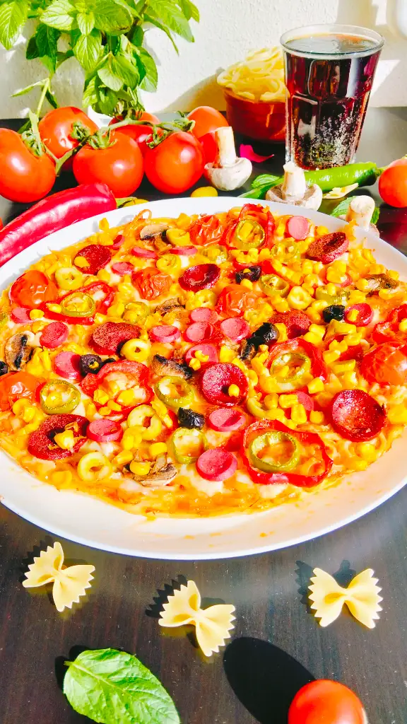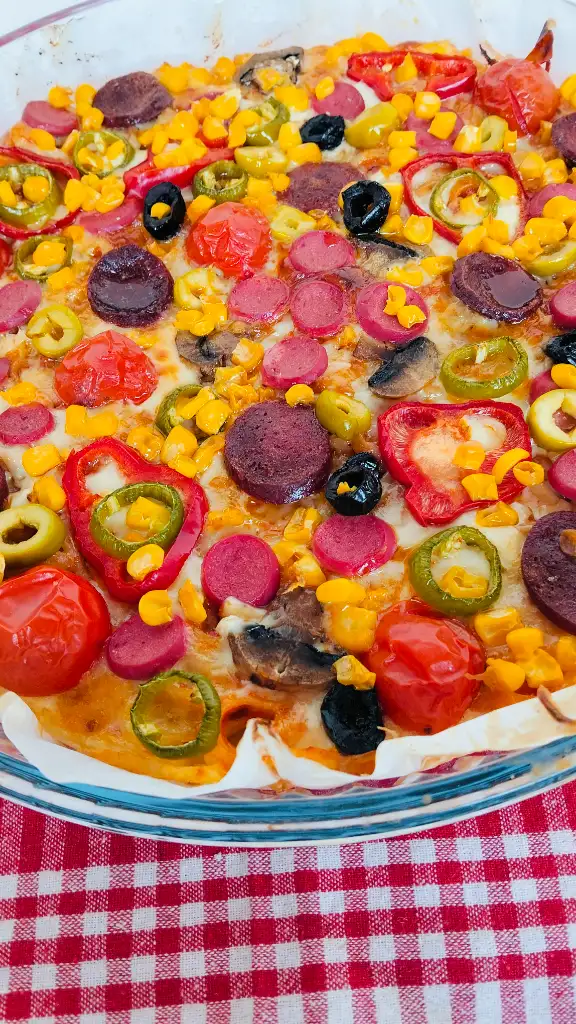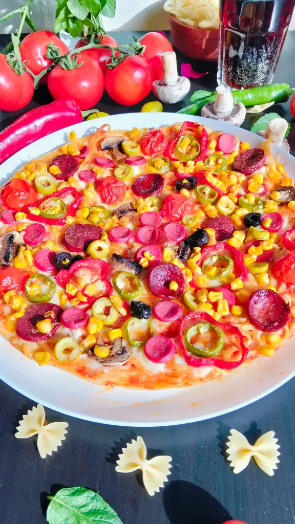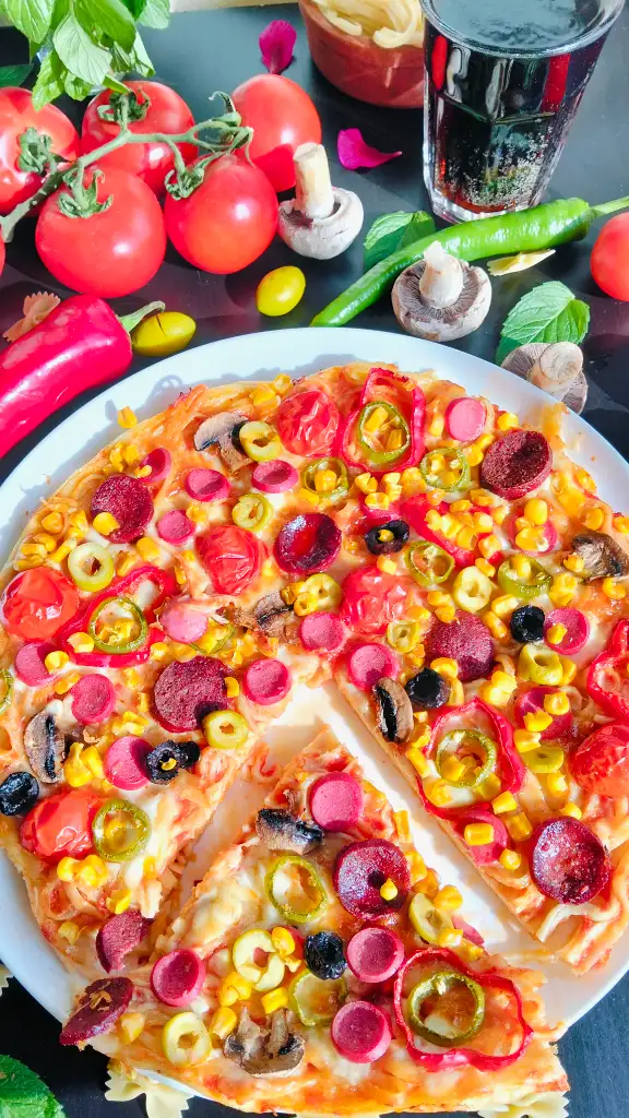-Soğuyan makarnanın üzerine sırasıyla Sosu, kaşar peynirini ve Pizza malzemelerini dizelim. Önceden ısıtılan 200 derece fırında pişirelim.