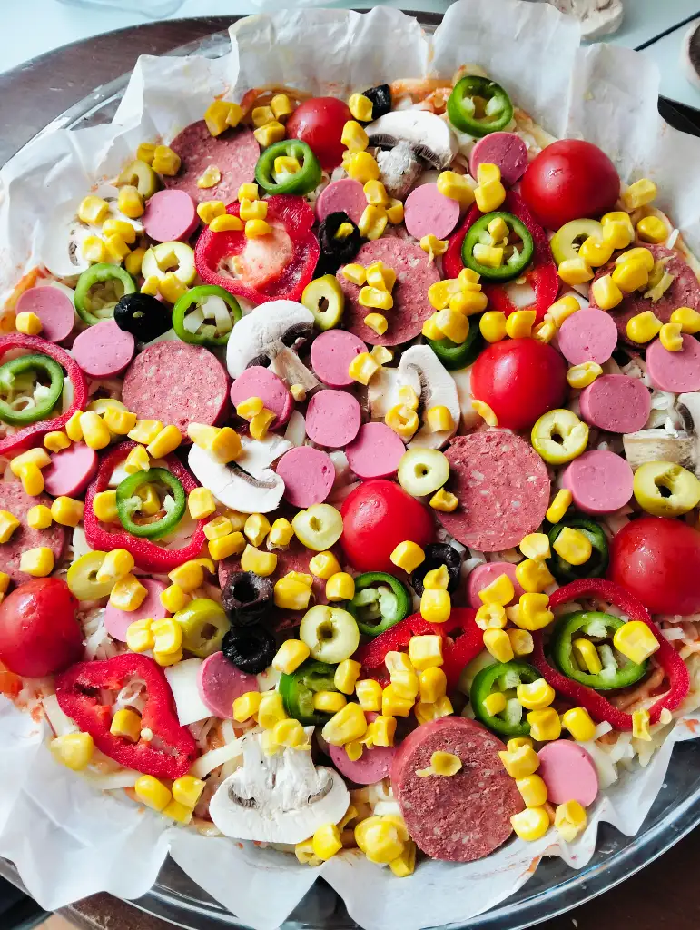 - İsteğe göre sucuk, salam, sosis, mantar, yeşil zeytin, siyah zeytin