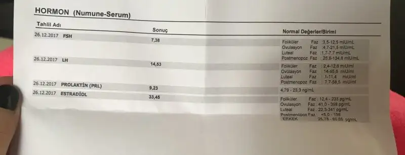 Merhaba. Ben de 8 aydır bebek istiyorum hiç hamile kalamadım. 23 yaşındayım 1.75 boy , 66 kilodayım. Düzenli bir doktora gidiyordum hormon tahlillerim ve vajinal ultrason oldu 3 kez. Hiç sıkıntı yok dedi sürekli doktor. En sonunda eşime de spermiogram yaptırdık o da kötü çıkmadı. Bu ay düzenli spor yapmama rağmen kilo veremediğim ve sürekli acıktığım için dahiyeye gittim kan verdim. İnsülin direncim 2.5 olması gerekirken 3.27 çıktı. Glocophage başlattı doktorum ve bu şekilde hamile kalamassın polikistik over olabirsin bi doktorunu değiştir dedi. Adet oldum şimdi ve 2. Gün gittim başka doktora. Ultrasonda hafif derecede polikistik over gözüküyor fsh ve lh a bakalım dedi kan aldı. Bugün sonuçlarımı gösterdim ve aşağıya da ekliyorum. Eşime E vitamini verdi bana da hafif iltihap var diye antibiyotikli iğne ve fitil verdi. Yumurtalar gelişsin diye de toz bir ilaç verdi. Bu ay kullan önümüzdeki ay adetin 3. Günü yine gel yumurta takibi yapalım dedi. 2 ay takipte hamile kalamassan aşılama yaparız dedi ve bu beni biraz korkuttu. Hamile kalamayacak kadar kötü mü hormonlarım ? Hafif derecedesin demişti ama. Bu doktor benim arkadaşımı doğurtan doktordu ve pimpirikli önlemci biri. Önceki doktorun gevşekliği yüzünden pimpirikli olmasını istemiştim ama aşılama şart mıdır sizce hamilelik için ? Eşime keçi boynuzu özü yediriyorum her sabah. Var modır yapabileceğim şeyler ? Bu arada adet döngüm 31 gün ile 37 gün arası değişiyor