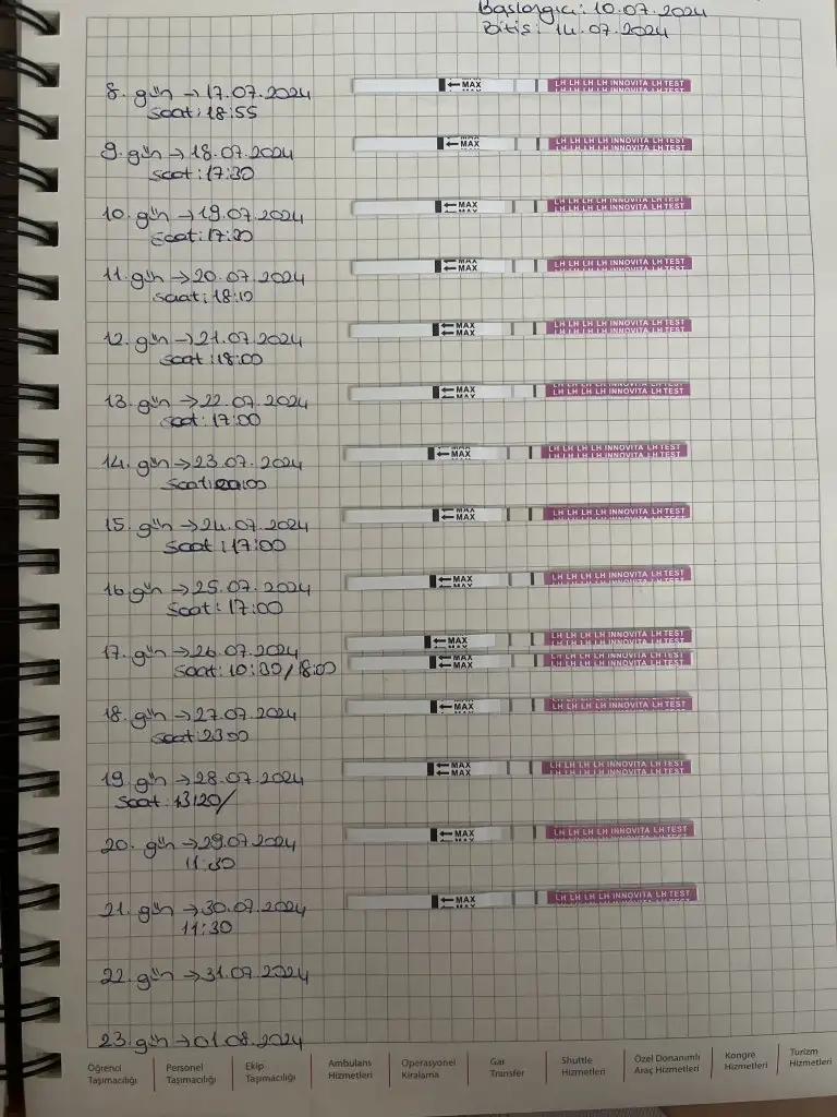 Herkese merhaba arkadaşlar. Eşimle 4-5 aydır bebek istiyoruz ancak herhangi bir olumlu sonuç alamadık. Polikistik over kaynaklı adet düzensizliğim olduğu için yumurtlama gününü tutturamıyoruz diye düşünmüştüm. Bu ay denemek için LH testi aldım. Fakat bugün testin 21. Gün olmasına rağmen (sanırım) hala pozitif sonuç alamadım. Ekte göndereceğim testlere bakıp bir yorum yapabilir misiniz? 24.07.2024 tarihindeki test pozitif olabilir mi? Daha önce hiç kullanmadığım için yorumlamayı da pek bilemiyorum
