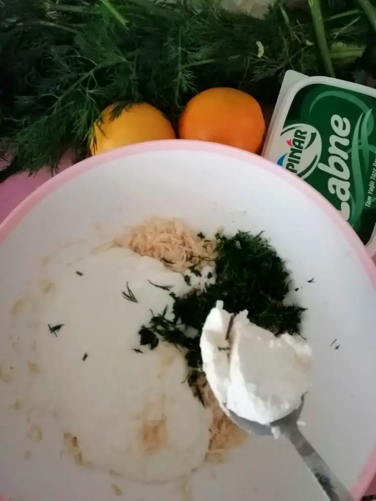 1 diş sarımsak rendeleyelim. 1 tutam dereotu doğrayalım. Tuzunu ilave edelim