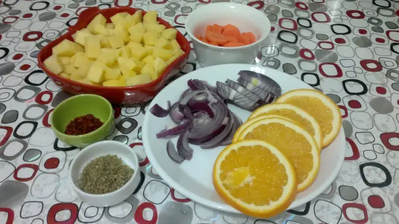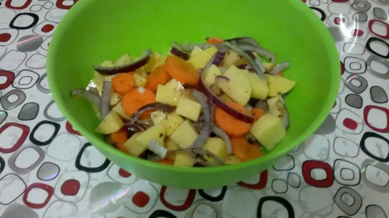 - Patatesleri ve havuçları yıkayıp kabuklarını soyun ve küpler halinde doğrayıp yıkayıp karıştırma kabına alın.Mor soğanı halka ,halka doğrayın..