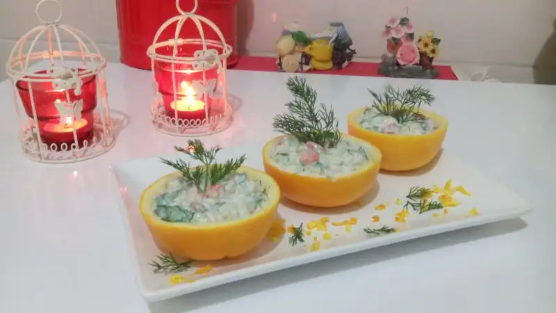 Hazırlanan yoğurtlu buğday salatası yaklaşık 1 saat kadar buzdolabında bekletilir.- kase olarak hazırladığımız portakallarımızın içine doldurup arzuya göre süslenir..