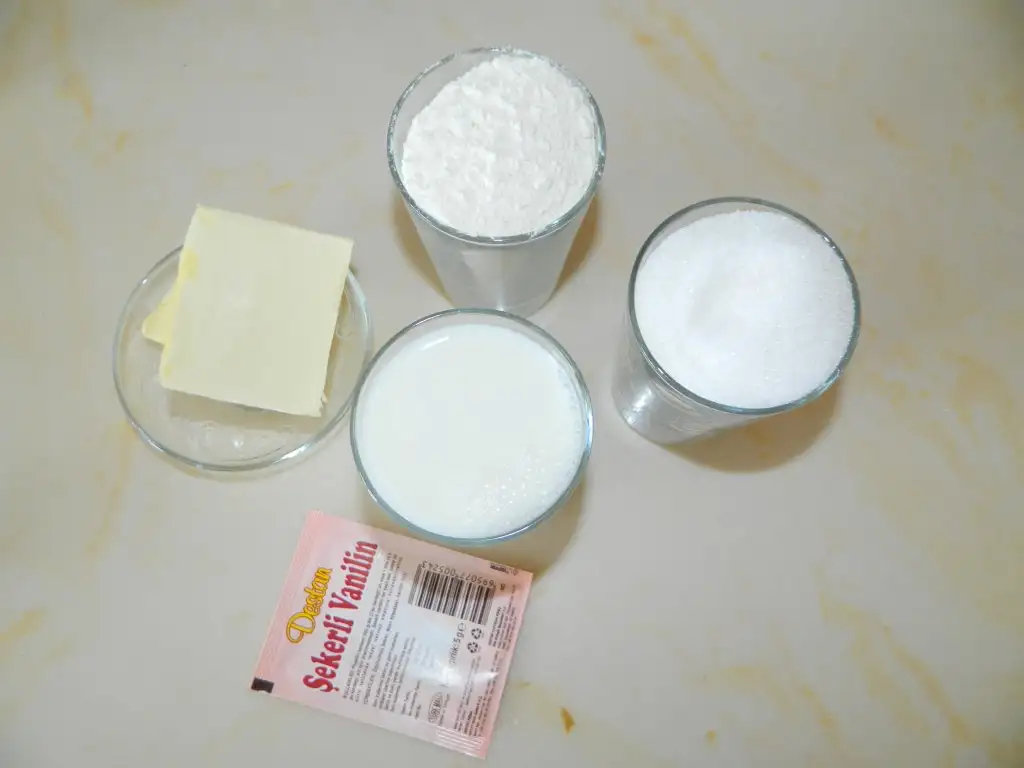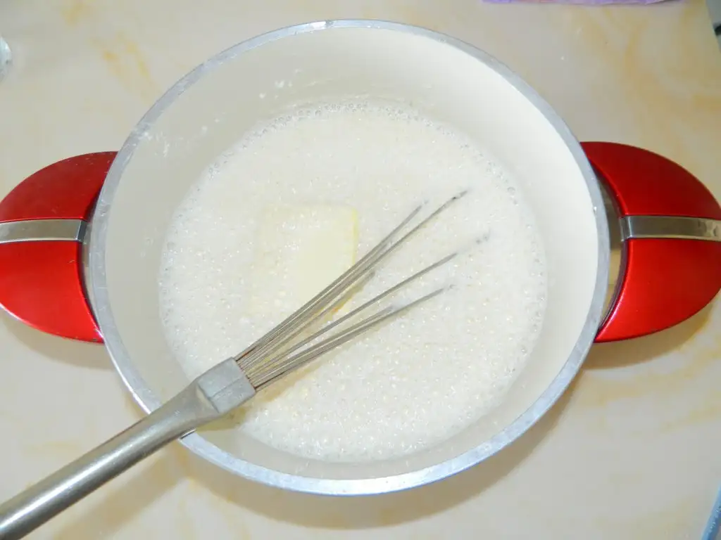 Daha sonra muhallebimiz için süt şeker un ve yağı soguk olarak karıştırıp kaynadıktan 5 dk sonra altını kapatıp soğutuyoruz buradaki püf nokta soguduktan sonra 5 dk mikserle çekmek