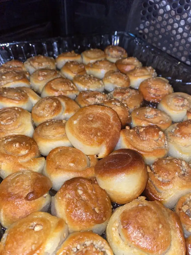 Böyle yuvarlak açıyon aşko biraz yağ sürüyor ceviz serpiştirip rulo yapıp kesiyorsun parmak kalınlığında mayalı hamurdan ya kabarıyor kolay birşey hafif ve lezzetli oluyor bayramlarda düğünlerde mevlütlerde hep yapıyorlar orda