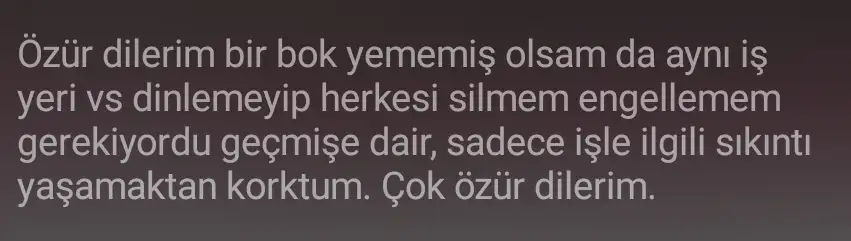 Dün bi nişana katıldık, nişan çıkışı erkekler dışarı çıktılar. İyi dedim. Gece geç saatte geldi oraya da tamamım zaten 12 gibi anca toplanıldı çünkü. Kapıyı çaldı, kapı deliğinden bakarken mesaj atıyordu ben kilidi açarken kitledi koydu telefonu cebine. İçeri girince kime mesaj attım dedim, buluştuğu arkadaşlardan biriyle tartışmış ona yazdım dedi.