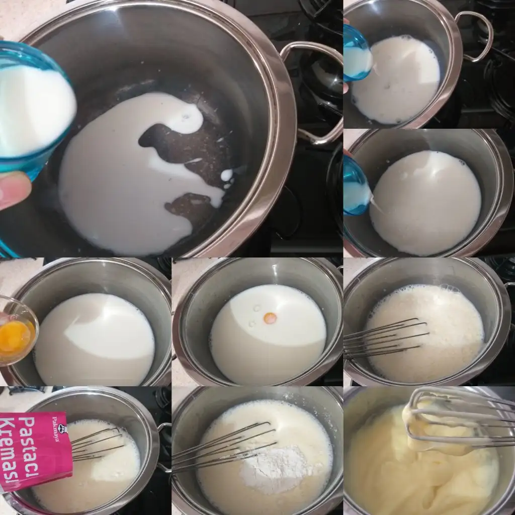 2.5 su bardağı sütü tencereye alıyoruz 1 yumurtayı 3 yemek kaşığı unu 1.5 su bardağı toz şekeri iyice karıştırıp ocağa alıyoruz karıştırarak kaynamasını bekliyoruz kaynayan kremaya 1 tatlı kaşığı tereyağını ve 1 paket toz vanilini ekleyip pürüzsüz kıvama gelene kadar karıştırıyoruz.
