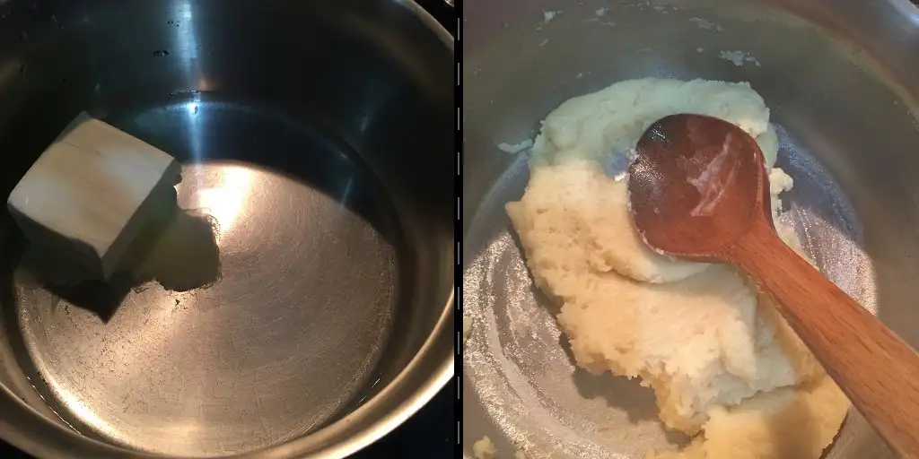 125 gr. yağ, 1 su bardağı su ile tencereye alınır, kaynamaya başladıktan sonra 1 su bardağı un ilave edilir, karıştırıldıktan sonra ocaktan alınır.
