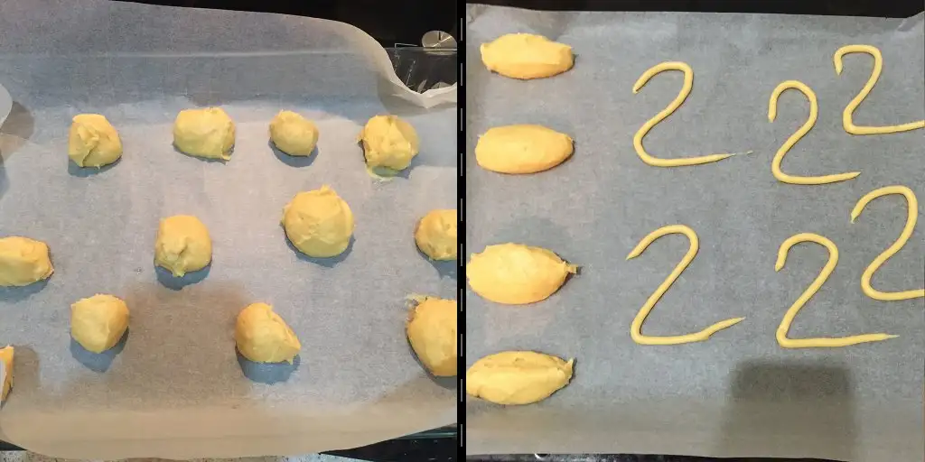 Hamur 5-10 dk dinlendirildikten sonra yemek kaşığı yardımıyla kuğu için; 4 adet hamur şekillendirilir, sıkma torbası veya buz dolabı poşetine doldurduğunuz hamurla “s” şeklinde 5-6 adet yapılır. Geri kalan hamurumuzdan, tatlı kaşığıyla yuvarlak hamurları araya boşluklar bırakarak tepsiye diziyoruz.
