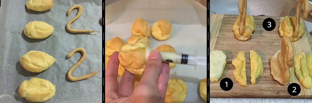 Fırından çıkardığımız hamurlardan önce kuğuları şekillendiriyoruz. Hamuru ortadan kesip üst kısmını uzunlamasına kesin. Tabanına kremasını doldurup, boynu yerleştiriyoruz, ardından katlarını yerleştiriyoruz.