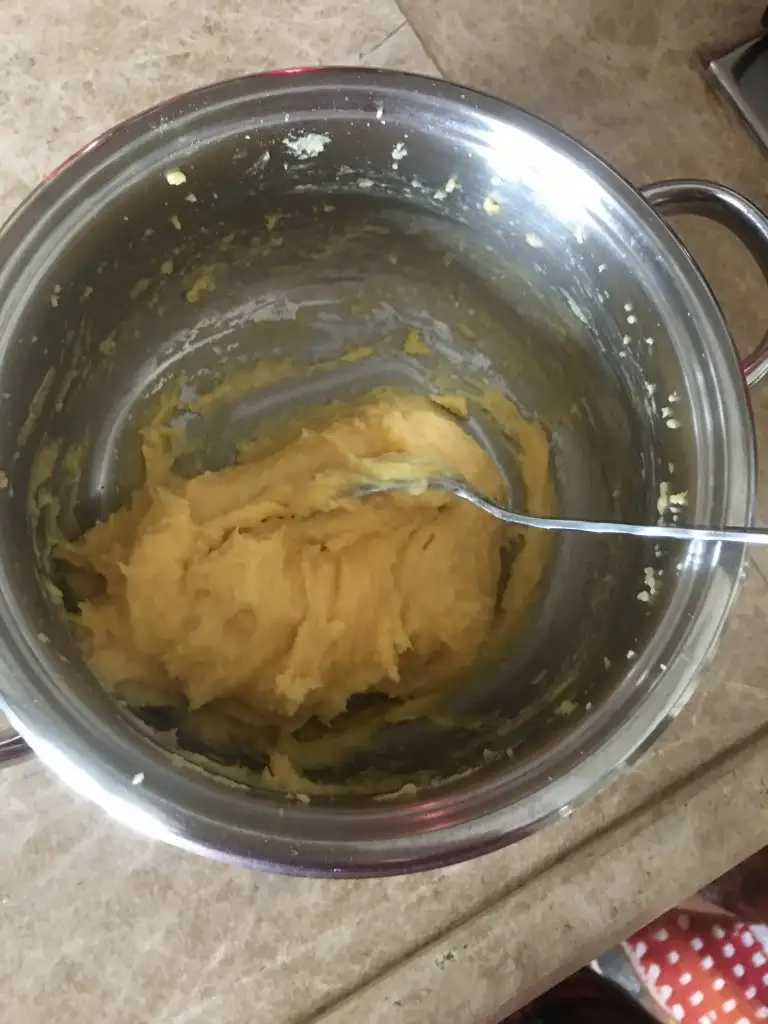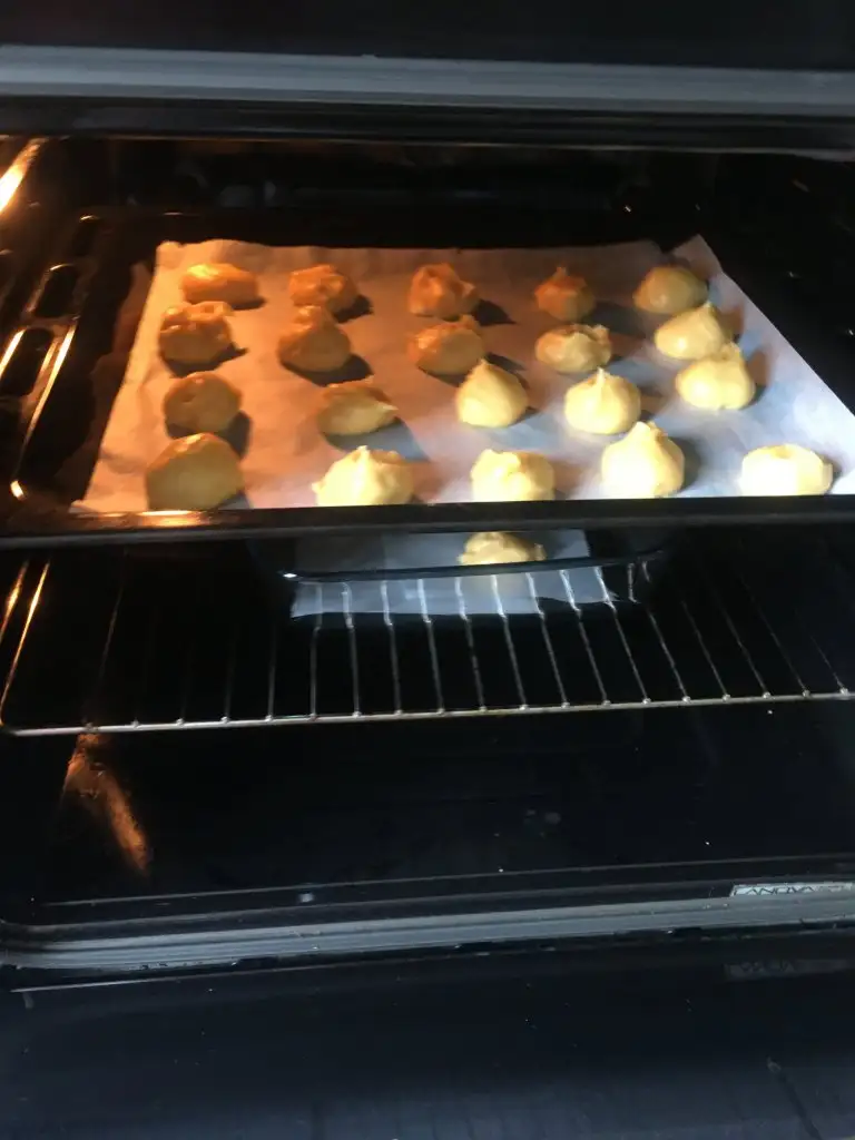 Hamurla başlayalım. Ufak bir tencereye su ve yağı alip ocaga koyuyoruz su kaynayip yag eriyince unu ekleyip cirpma teliyle hizlica cirpiyoruz. 2 3 dk bu şekilde karistirarak pisiriyoruz. Daha sonra 10 dk sogumaya birakiyoruz. Soguduktan sonra yumurtalari tek tek ilave edip her yumurtayi iyice karisana kadar cirpiyoruz. Ben mikserle çırptim diger türlü cok yorucu olur. Hamuru cevizden daha ufak olacak sekilde kasikla tepsiye dizelim aralarinda aralik olsun. Ben cok ufak yapmama ragmen asiri kabardi toplarimkabarmasi guzel bisey tabi