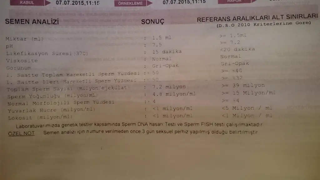 sizin sperm sayısında skıntı var ve morfolojide tam sınırda bence sperm artırıcı ve morfolojiyi düzenleyici kürleri deneyimSelamlar arkadaşlar , eşimimn Sonuçları : Böyle ... Sizce Nasıl sonuç alabiliriz ? Uzun zamandır istiyoruz , olmuyor ( 3 sene )