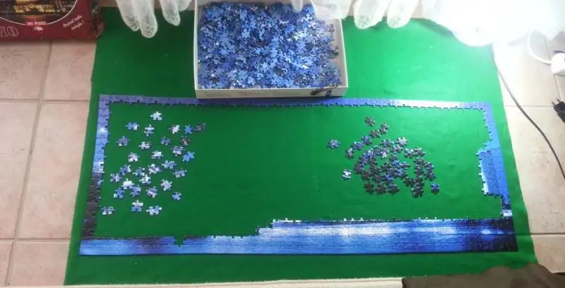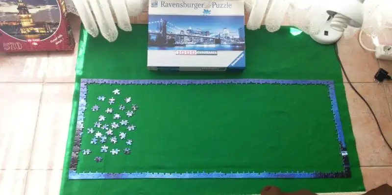 Bu da benim sürüm sürüm sürünen puzzle ımın bugün öğlen saatlerindeki haliBir kısmını daha bitirdim aslında, makine yanımda değil şimdi, onun için çekemedim Gelirse çeker atarım