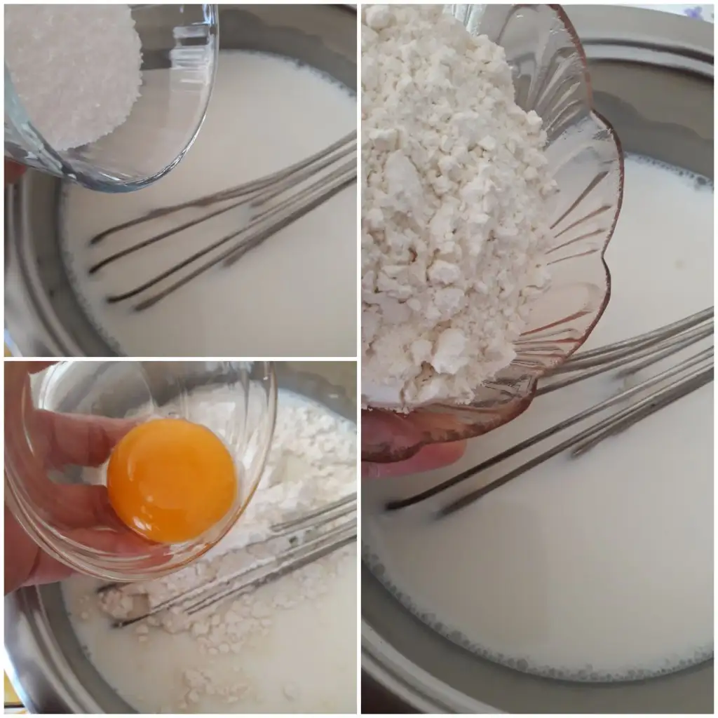 bir tencereye süt, un, yumurta sarısı, şekeri alıp güzelce karıştıyoruz. Ocaga alıp kaynayana kadar karıştırmaya devam ediyoruz.