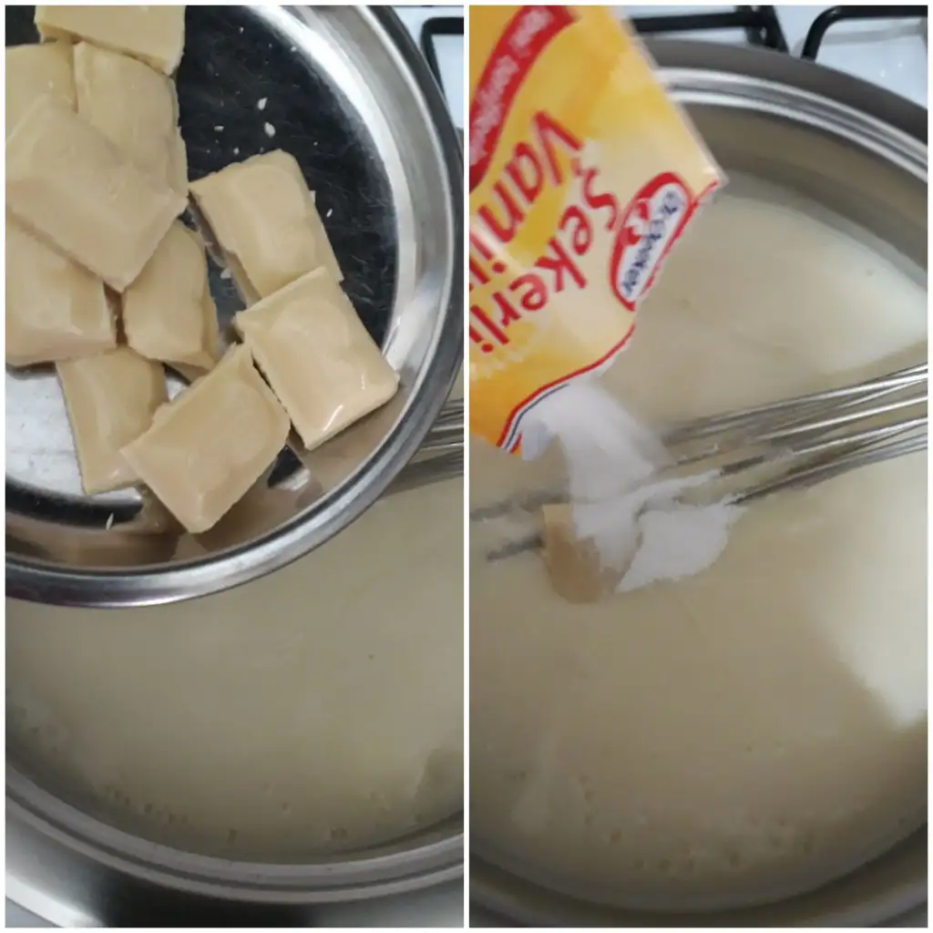 kaynayıp yoğunlastiktan sonra içine çikolata ve vanilyayı ekleyip çikolata eriyene kadar karıştırıyoruz.