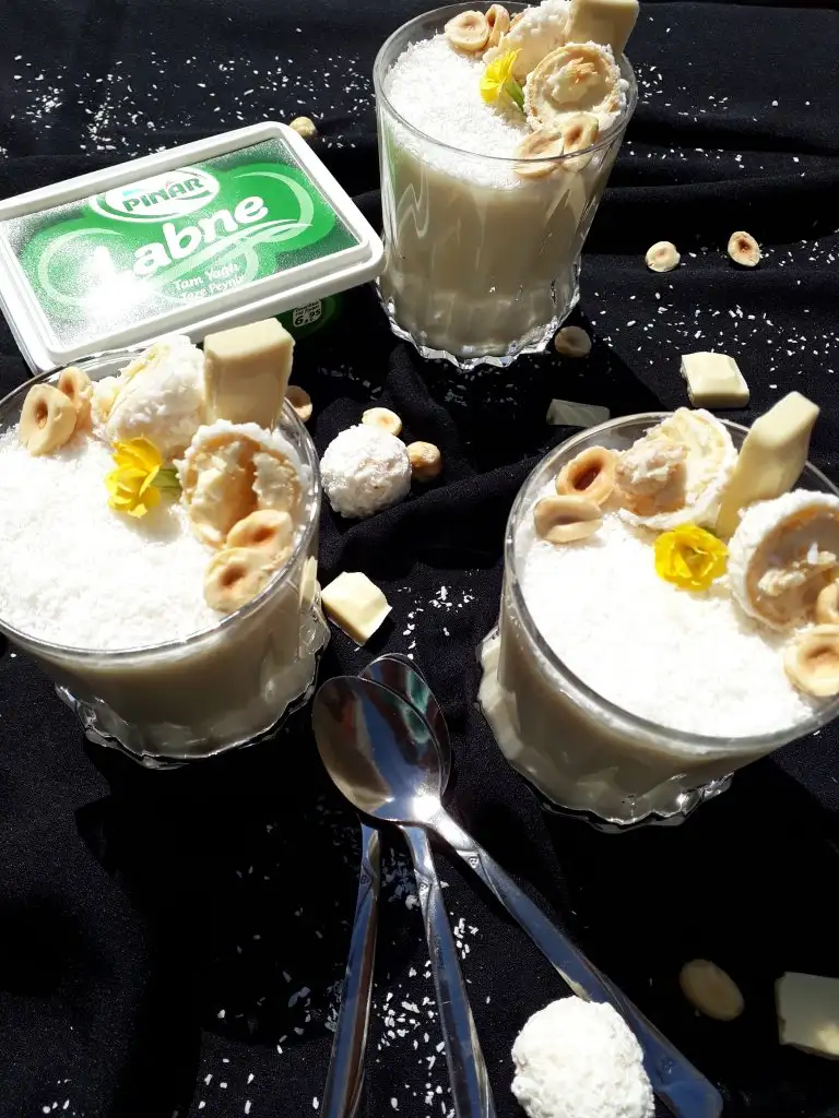 tatlımız hazır. Ister bardak ister kasede sunum yapabilirsiniz. Ilk sıcaklığı çıktıktan sonra üzerine bolca hindistancevizi döküyoruz.