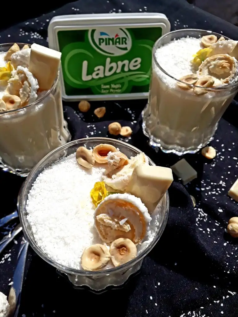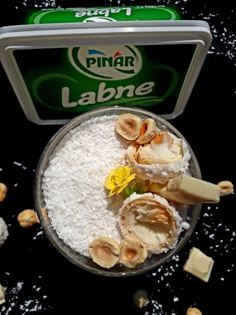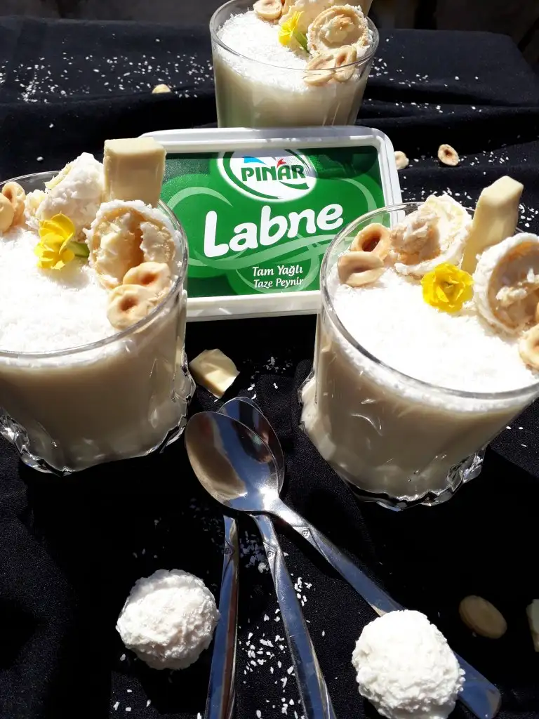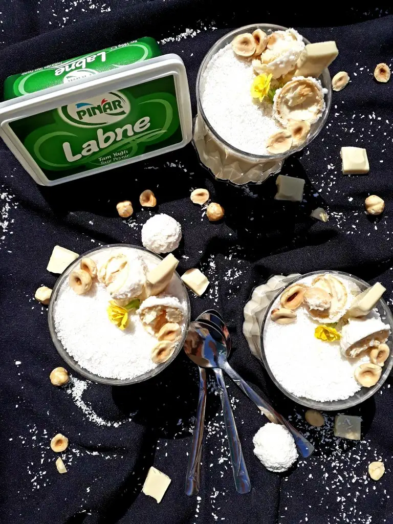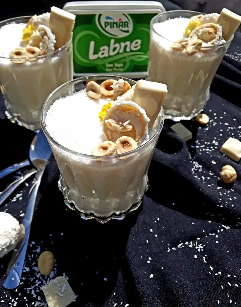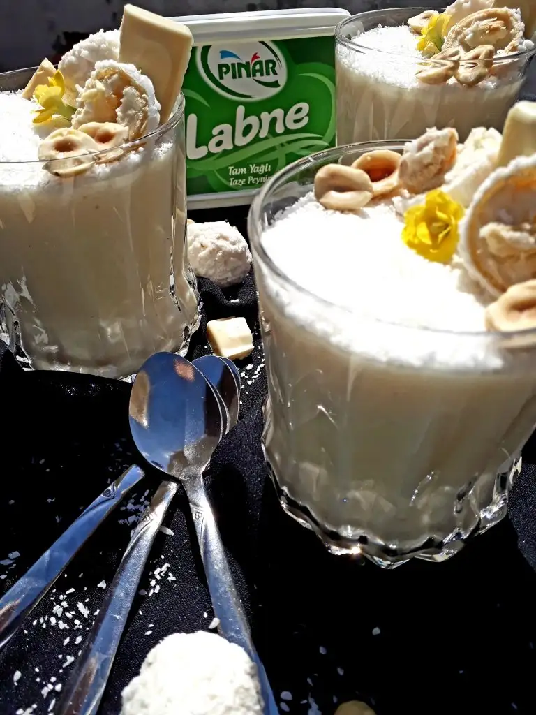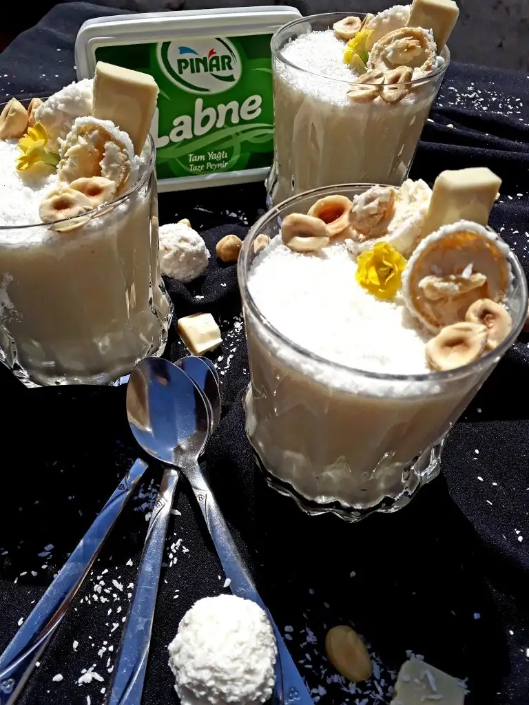 daha sonra içine bir su bardağı hindistan cevizi ve labneyi ekleyip mikser ile karışmasını sağlıyoruz.