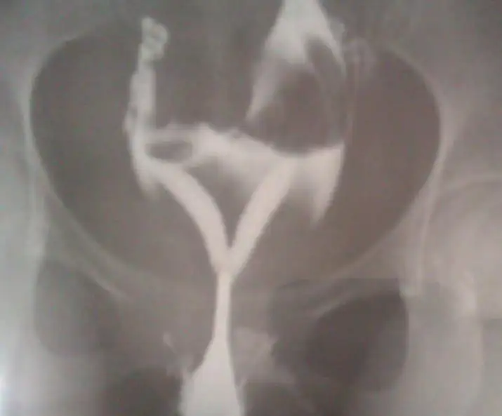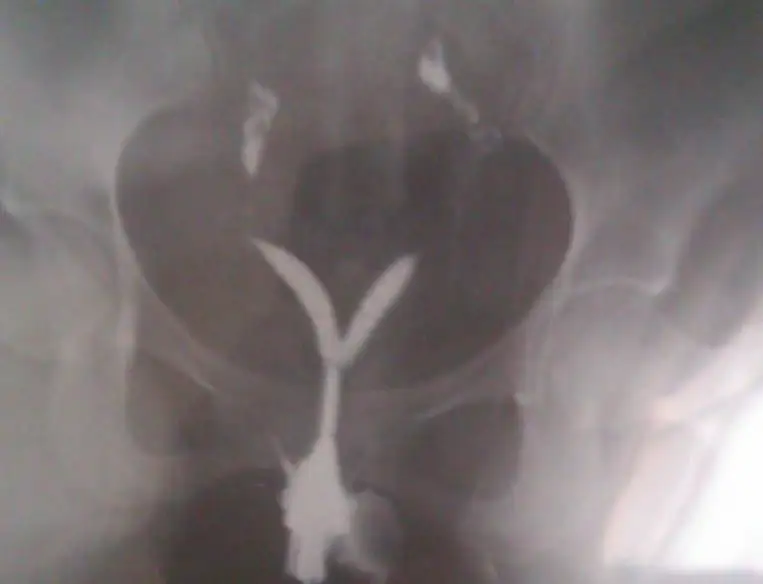 merhaba arkadaşlar.ben aranıza yeni katıldım. ben 2,5 yıllık evliyim. 2 yıldır bebek istiyorduk ve sonunda geçen ay hamile kaldım fakat 5 haftalık bir gebelik sonucu düşük yaşadım malesef. doktor muayenede rahimimim çift olduğunu ve rahimde perde olduğunu ayrıca rahimimin ters olduğunu söyledi.ve rahim filmi istedi.bu hafta rahim filmini çektirdik.fakat rahim emarı da istiyor doktorum onu da haftaya çektireceğim. şimdi resimlerini yüklüyorum rahim filmimin.sizce rahimde perde mi var yoksa rahim çift mi ? internetten araştırdım şekline bakılırsa ''Uterus bicornis'' gibi geliyor bana. daha doktorum bieşy demedi.emarı da görüp öyle söyleyecekmiş.sizce nedir? çift rahim mi yoksa rahimde perde mi ????