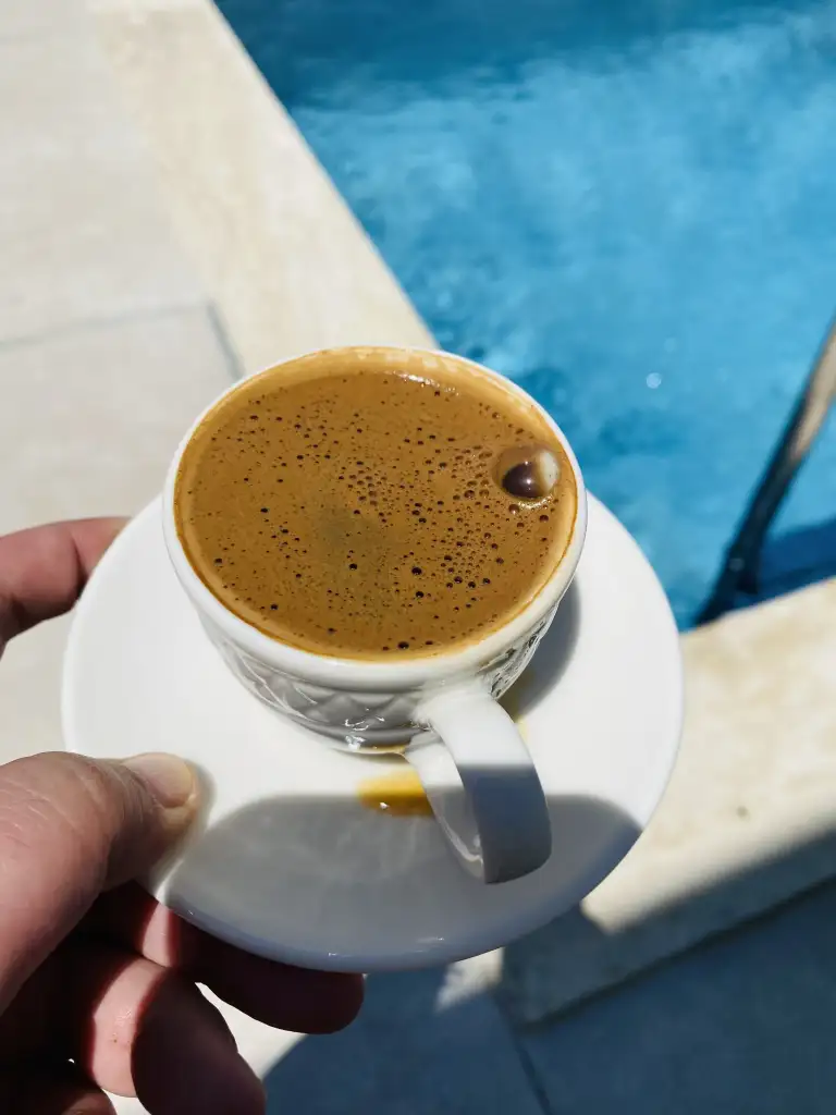 Hain domdom. Hem havuz başında hem de kahvesi yine bol köpüklüBulunduğum yerde cezve yok Deynep’im, makine ile ve sabah kahvesi olur mu?Eki Görüntüle 3628337