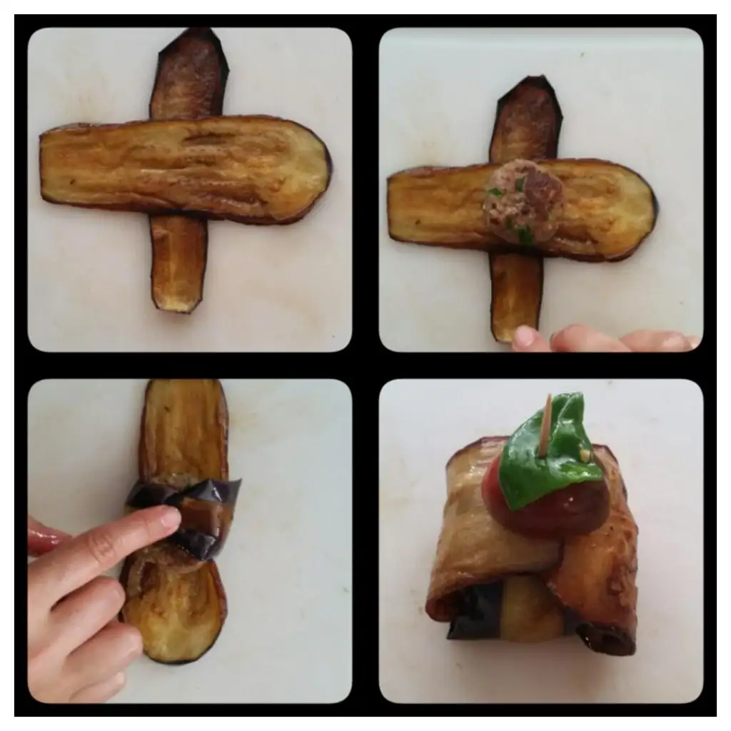 Patlicanlarimizi sekildeki gibi arti isareti gibi ustuste koyarak ortasina kofteyi yerlestiriyoruz ve bir kurdan yardimiyla uzerine domates ve biber yerlestirerek sabitliyoruz. Ben bazi buyuk patlicanlari tek sekilde sardim.