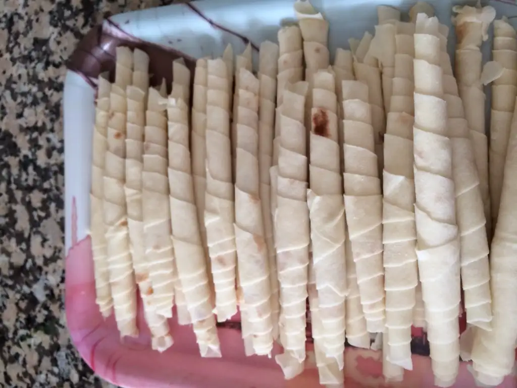 Pipet yardımıyla börek sarar gibi yufkamızı sarıyoruz ucunu suyla ıslatıp yapıştırdıktan sonra pipetten sıyırıp bir tabakta biriktirelim.