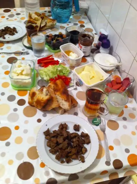 Eşime: İftardan kalan et sote, pirinç pilavı, ayran, kavun, çay