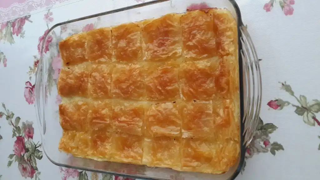 Ben üst yazımda da belirttiğim gibi küçük bir borcam kullandım (20x30cm büyüklüğünde). Bu nedenle yufkaları ikiye kesince kabıma neredeyse tam oldular. 12 baklava yufkasını kabımın boyutuna uygun olacak şekilde 2 ye kestim ve 24 yufka elde ettim. Yufkaları kurumalarına izin vermeden itina ile paketleyip gerektiğinde çıkarttım. Borcamın tabanını erimiş yap ile yağlayıp 1. yufkayı serdim. Üzerine tekrar yağ sürdüm. 2. yufkayı üzerine serdim tekrar yağladım. Bu şekilde 10 yufkayı aralarına yağ sürerek üst üste dizdim. Ilınmış olan muhallebimi döküp yaydım. Sonra geriye kadar 14 yufkayı da muhallebinin üzerine, aralarına yağ sürerek serdim. En üst kat için yağınıza sıvı yağ ekleyerek sürebilirsiniz daha çok kabaracak ve kıtır olacaktır. En üst katı da yağladıktan sonra bu tatlının en önemli kısmı olan kesme aşamasına geçtim. Keserken muhallebinin çıkmasını istemeyiz bu nedenle dikkatli olmakta fayda var. Muhallebi zaten koyu kıvamlı olduğu için endişelenmeye gerek yok aslında. Tırtıklı bıçak ile çok kolay bir şekilde kesildiğini gördüm. Yavaş yavaş çok da küçük olmayan kareler kestim. 200 derecede ısıttığım fırında üzeri kızarana kadar pişirdim.
