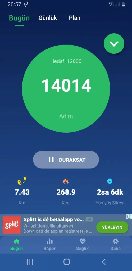 Benim adimsayara gicik oldum ben. Takiliyor galiba arada. Zamani bile eksik gosteriyor tam 45 dk yürüdüm oncesinde de 30 vardi ama orda 1 saat bile olmadi. Cok yorgunum benden bugunluk bu kadar