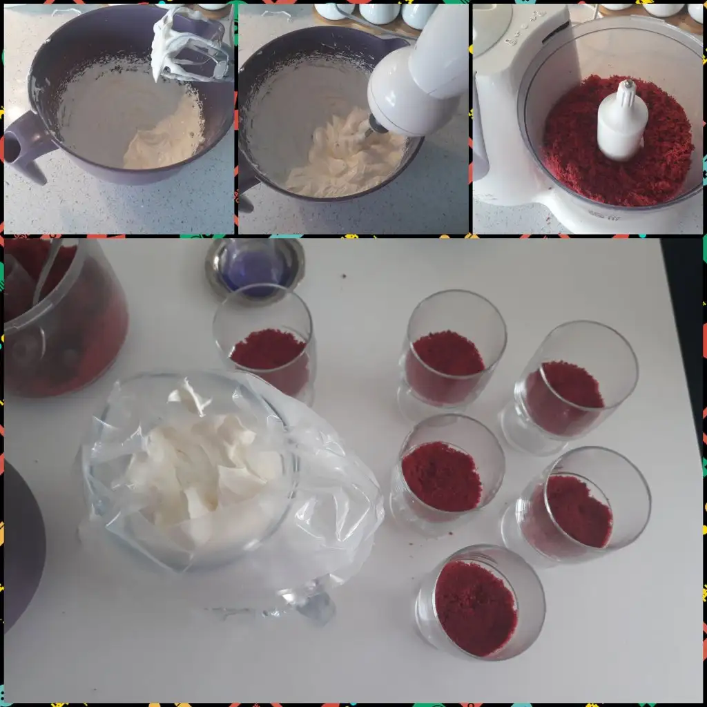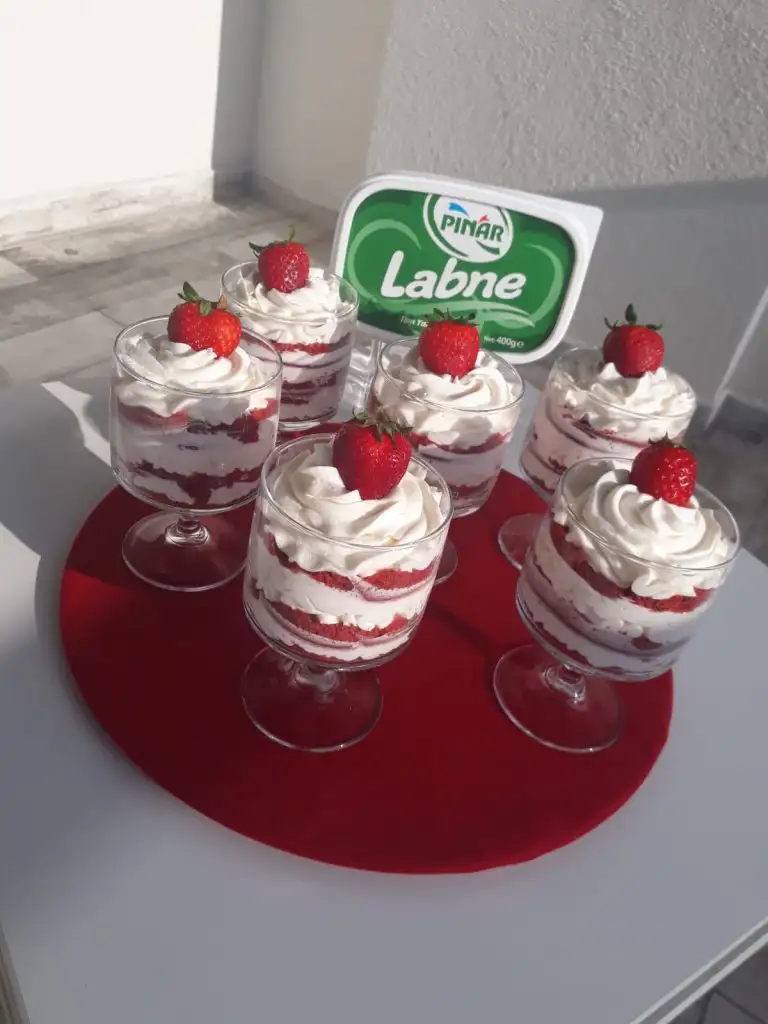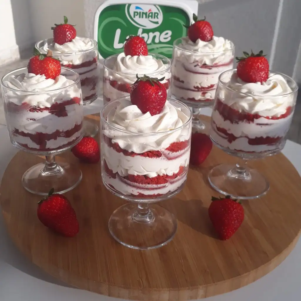 Kremamızı sıkma torbamıza alıyoruz. Cuplarımızı hazırlıyoruz. Benim 6 tane çıktı. En alt kısma kırmızı kek kırıntılarından bir kaşık sonra krema sonra kek kırıntısı şeklinde diziyoruz. Buzdolabında birkaç saat dinlendiriyoruz. Arzuya göre süslüyoruz. Ben çilek kullandım.