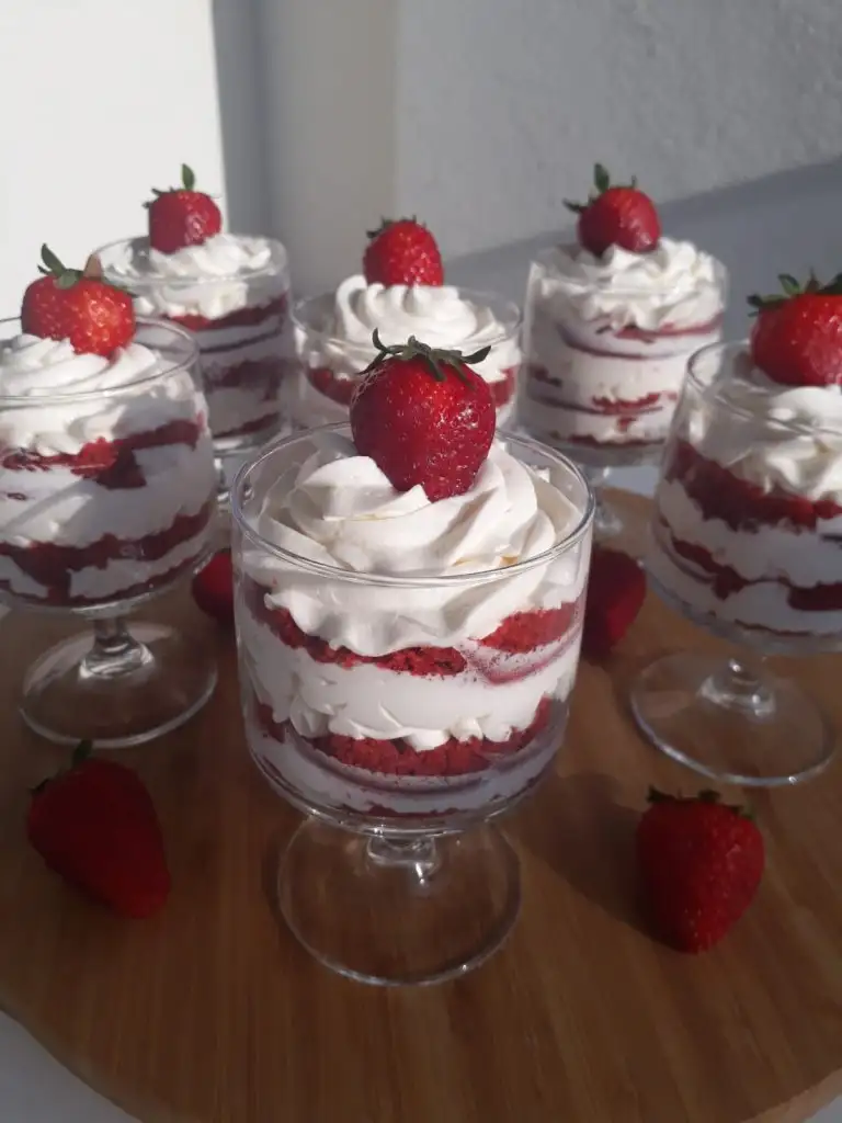 Kremamızı sıkma torbamıza alıyoruz. Cuplarımızı hazırlıyoruz. Benim 6 tane çıktı. En alt kısma kırmızı kek kırıntılarından bir kaşık sonra krema sonra kek kırıntısı şeklinde diziyoruz. Buzdolabında birkaç saat dinlendiriyoruz. Arzuya göre süslüyoruz. Ben çilek kullandım.
