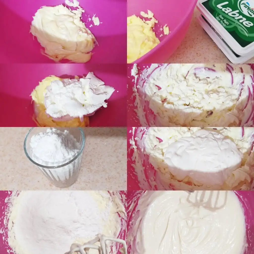 150 gr tereyağını çırpıyoruz krema haline gelene kadar çırpıyoruz. Üzerine 300 gr pınar labneyi ekleyip karıştırıyoruz. 1 su bardağı pudra şekerinide ekliyoruz ardından 1 paket krema ekliyoruz. İyice kıvam alana kadar çırpıyoruz.