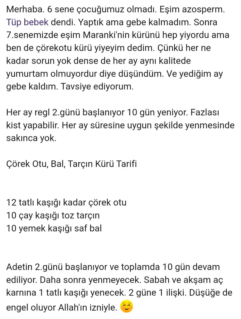 Hiçbir şey olmaz zamanı geldiyse. Rızkı oluştuysa. Gönlünü ferah tut. Ben 6 ay önceden beslenme düzenimi değiştirdim. Karatay kitaplarını okuyup un, şeker vs bıraktım elimden geldiğince. İncir kürü uyguladım yumurtlama günüme kadar. Haşlanmış havuç yedim akşamları. Yumurtam büyümüyordu. Qenzim takviyesi verdi doktor. Belki bu tarz destekler yapmışsındır ama benimkiler de bunlardı🌿