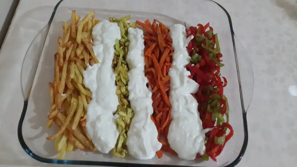 Patates, kabak, havuç, ve biberleri sırayla kızartıyoruz ve aralıklarla servis kabımıza diziyoruz.
