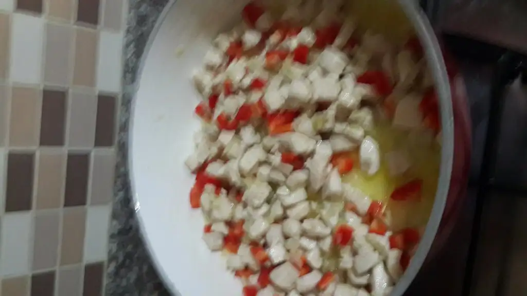 Tavukları, soğanları, biberleri küp küp doğruyoruz.