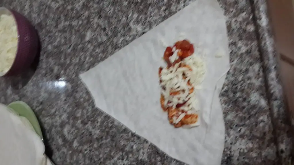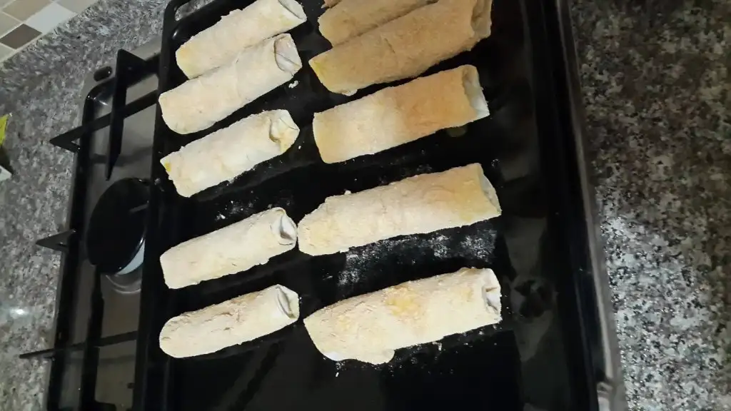 Her yufkanın içine önce tavuklu harç sonra rendelenmiş kaşar peyniri koyuyoruz ve sarıyoruz.