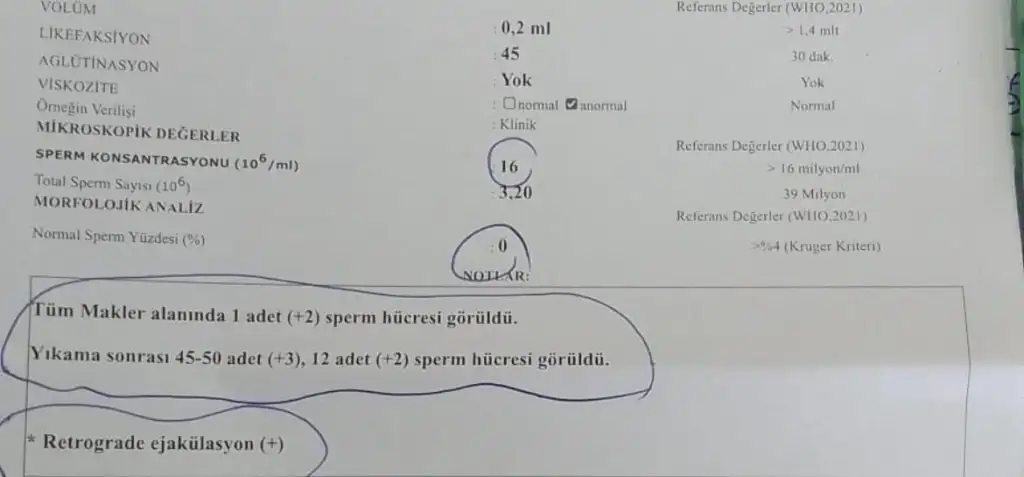 En son verdiği spermiyogram testinde idrardan çnce meni çıkışı oldu. Fakat normalde 1.4 ml olması gerek ondan 0.2 ml çıktı. Fakat bana umut olan spermin bi şekilde çıkmış olması.
