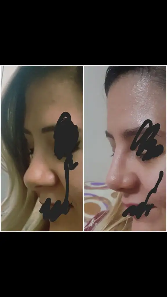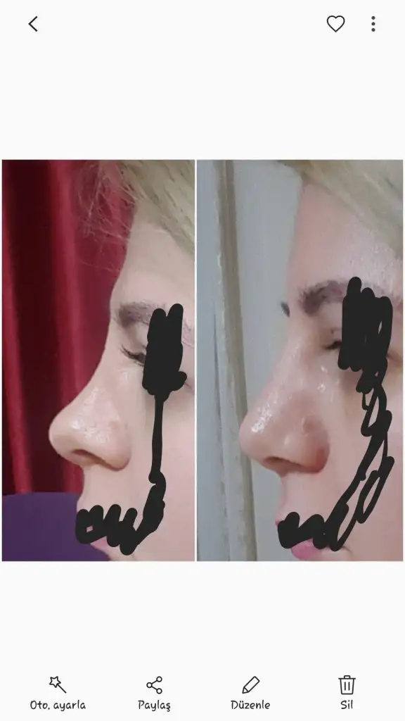 Burun sırtımın önceden çökük olan sağ tarafı şimdi fazla şiş   Şimdi sol taraf çökük gibi duruyor. Sert ancak masaj yapınca biraz iniyor gibi sonra yine şişiyor yani ödem olduğu belli aslında. Kalın derili cilde sahibim bu yüzden daha uzun zaman alacak ödemin inmesi farkındayım. O bölge önceden çöküktü ve o bahsettiğim kesilen kas da o sağ kısımdaydı. Daha çok işlem yapıldığı için ekstra dokular birikti oraya muhtemelen ve bu ameliyat öncesinden öngörülemeyen bir şey.