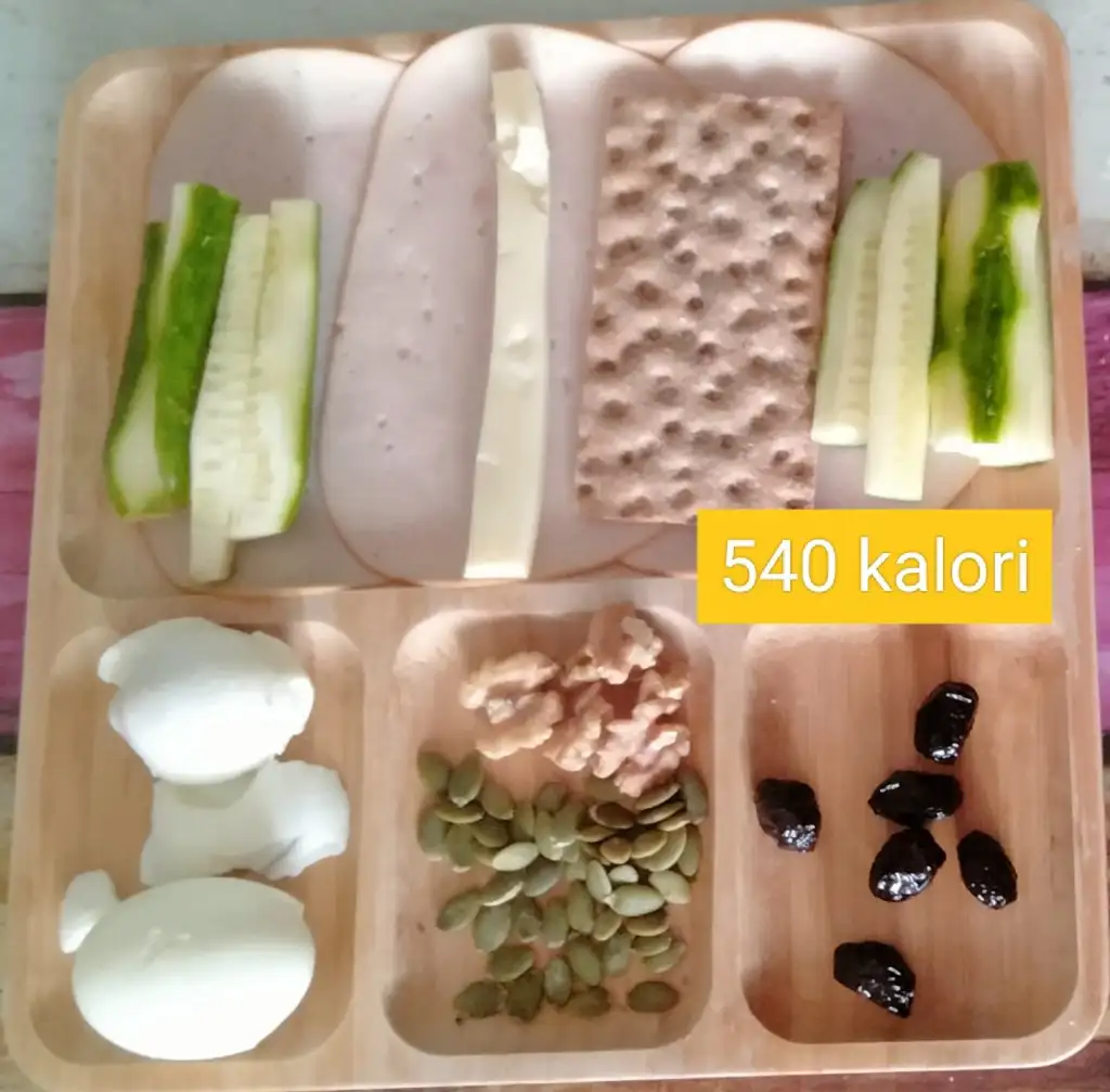| Siyah zeytin, salatalık, 2 muz, 25 gram eski kaşar, 60 gram hindi füme, 2 haşlanmiş yumurta, yoğurtlu brokoli, tavuk döner | 1.800 | 1 sallama beyaz çay |