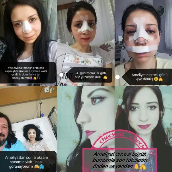 Tamponlara veda... cok korkutucu ve sanki ameliyatınızı o an bayiltmadan yapıyor gibi acı çekiyorsunuz. Dr dokundukca elini itip yeter dokunma artık diyordum. Bantlar çıktı tamponlar çıktı içi temizlendi alçı çıktı dikişler alındı son olarak dışı temizlenip masaj yapıldı ve aynaya bak sürprizzzz. Wuwww bu benmiyimmm... eski fotomu yanıma koyup tekrar onunla aynaya bakmami istedi hocam baktım ve büyük değişim gerçekten. Eline emegine sağlık gerçekten çok titiz çalışmış..