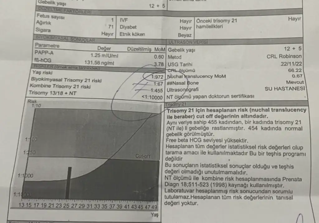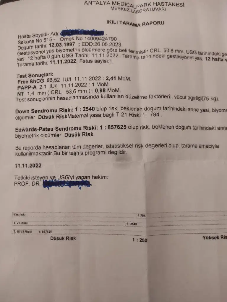 Yaş riskiniz yok 784 kişide bir. Down sendromu riski 2540 kişide bir. Bunun neresi risk anlamadım. Zaten düşük risk yazıyor. Doktorlar komisyon falan alıyor sanırım bu testlerden artık ona inanıcam.Yaaa öyle mi dersiniz doktorum istediği için ben Amerika'ya kan gönderdim ama bana riskin var dedi