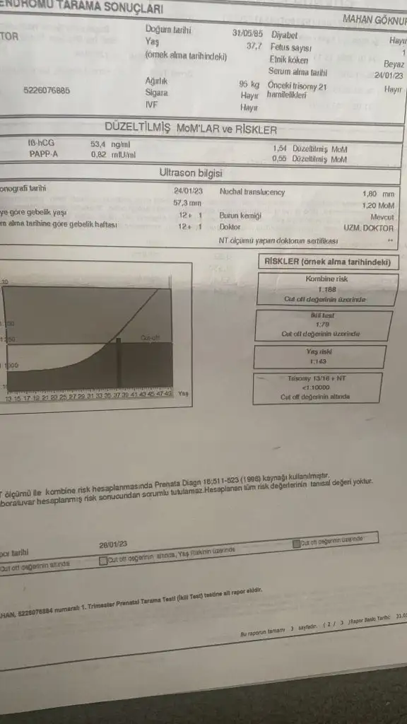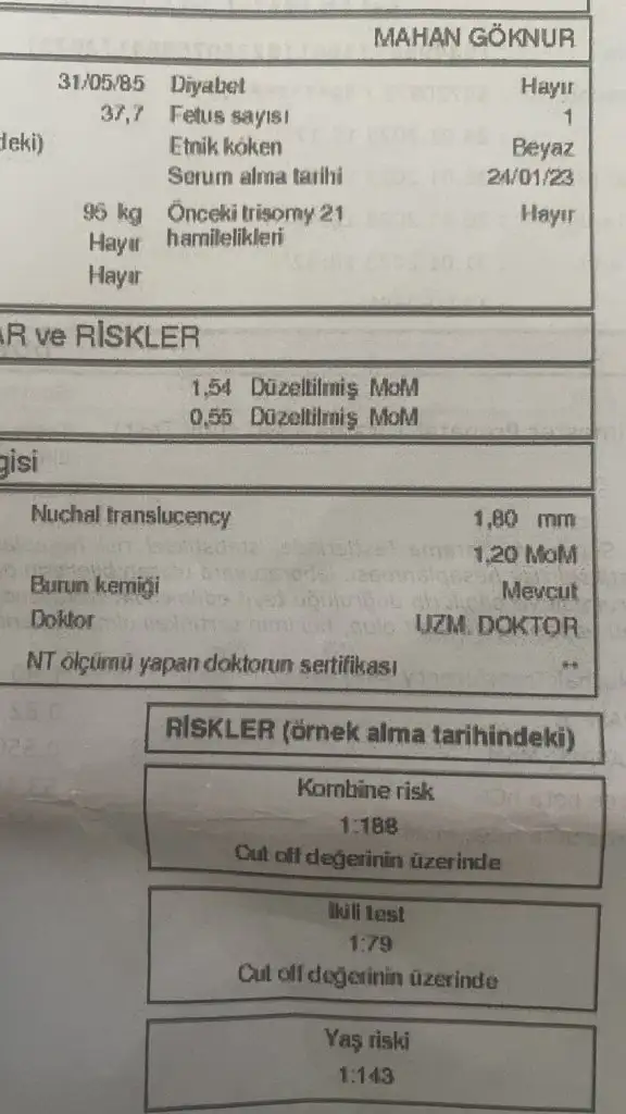 Aynı olayı 2 gün önce yaşadım beynimden kaynar su boşaldı ultrasonda ikili normal herşey dedi doktorum kanda papp-a 1.88 serbest beta hcg 161 yani riskli dedi amiyosentez istedi veya fetal dna testi o günün şokuyla çıktım hemen hastaneden karar vermeden iki gündür bakmadıgım yorum soru doktor kalmadı yarında fetal dna için gideceğim hastaneye inşallah benimki de temiz çıkar6 yıl sonra tüp bebek yönetimiyle gebe kaldım. 11.haftamda yapılan ultrasonda burun kemiği vardı ve ense kalınlığı normaldi fakat ikili tarama testi sonucum riskli çıktı yaşım da 27. Free beta hcg değerim 242 papp a değerim 1.34 çıkmış. Biri yüksek biri düşük bu da otomatik olarak riski artırıyor. özellikle fbhcg değerim yüksekti. Hemen o gün fetal DNA için kan verdim o geçen 10 günde neler yaşadım sadece Allah bilir. Çok şükür bugun sonuç geldi. TEMİZ ÇIKMIŞ. Bu on gün boyunca okumadığım soru girmediğim site kalmadı. Belki birilerine umut olur diye yazmak istedim. Bir daha hamile kalırsam ikili test falan yaptırmam
