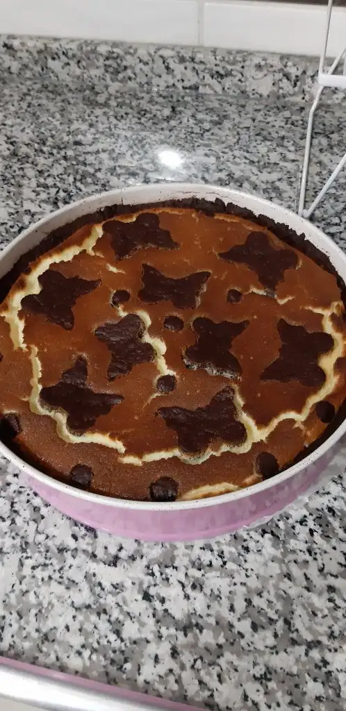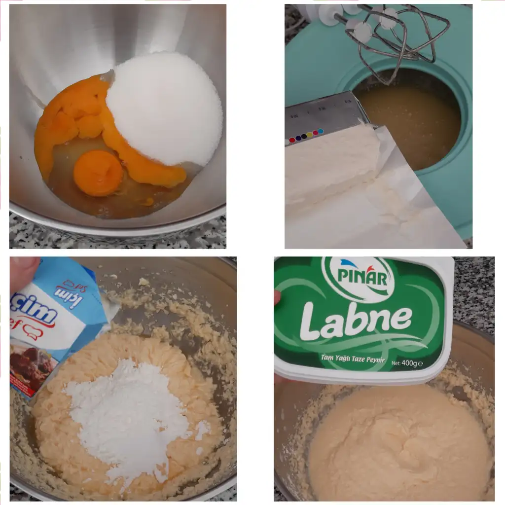 Şimdi sıra harcımıza geldi(Önce fırını 180 dereceye getirip içerisinde bir kap su bırakalım ısınadursun). Yumurtalar ile şekeri biraz çırpıp ardından teryağını ekleyip çırpmaya devam edelim. Sonra sıvı krema, nişasta ve labneyi ekleyip çırpmayı sürdürelim. Şimdi bu aşamada çırpma aletini bırakıp spatula alalım elimize. Bir paket vanilya ve 1 limon kabuğu rendesi ile yarım limonun suyunu ekleyip spatula ile karıştıralım. Harcımızı kalıbımıza dökelim. Başta ayırdığımız küçük hamur parçasını ister gelişigüzel parçalar halinde ister kurabiye kalıpları ile şekillendirerek harcımızın üzerine bırakalım. Ben kelebek desenli kalıp kullandım.