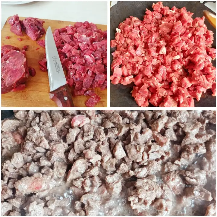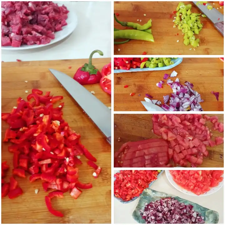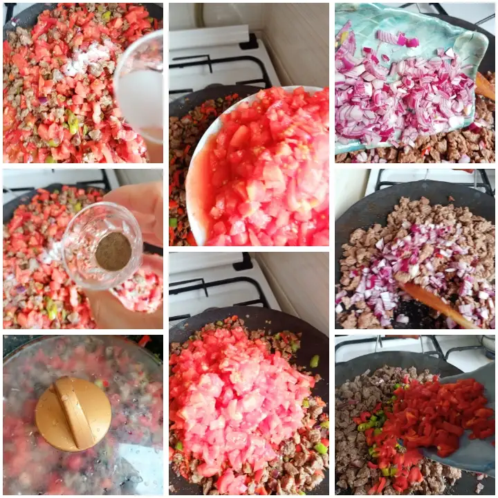 Önce ocağa koyduğumuz ısınan sacın içine etlerimizi döküyoruz. Daha sonra etlerimiz suyunu saldiginda ve çekmeye döndüğünde önce siviyagi olmak üzere bütün dogradigimiz soğan,biber ve domateslerimizi ekliyoruz ve karıştırıyoruz.