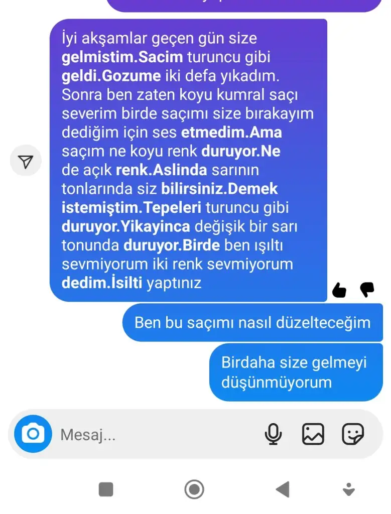 istiyorum.Dedim.Diplerde siyah sevmiyorum kumral gibi de olur dedim.İsilti istemiyorum dedim.İsilti kendisi dedi.Sonra size bırakıyorum dedim.Sacim bu halde.Birde 9 10 yaşlarında çocuk boyadı saçımı.