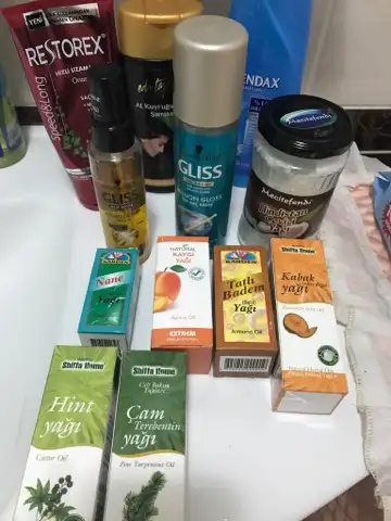 Haftada 1 gün de tatlı badem yağı, hint yağı, kayısı yağını birer kapak karıştırıp saçlarıma sürüp 1 saat kadar bekletiyorum.