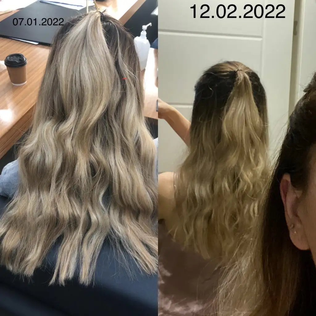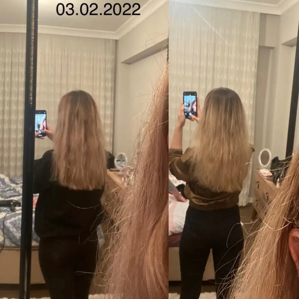 Saçlarım sarı olduğu için çok yıprandı 1 ay sonunda 10 cm kestirdim ama var 1 aydaki fark onu atayım hatta 3 hafta